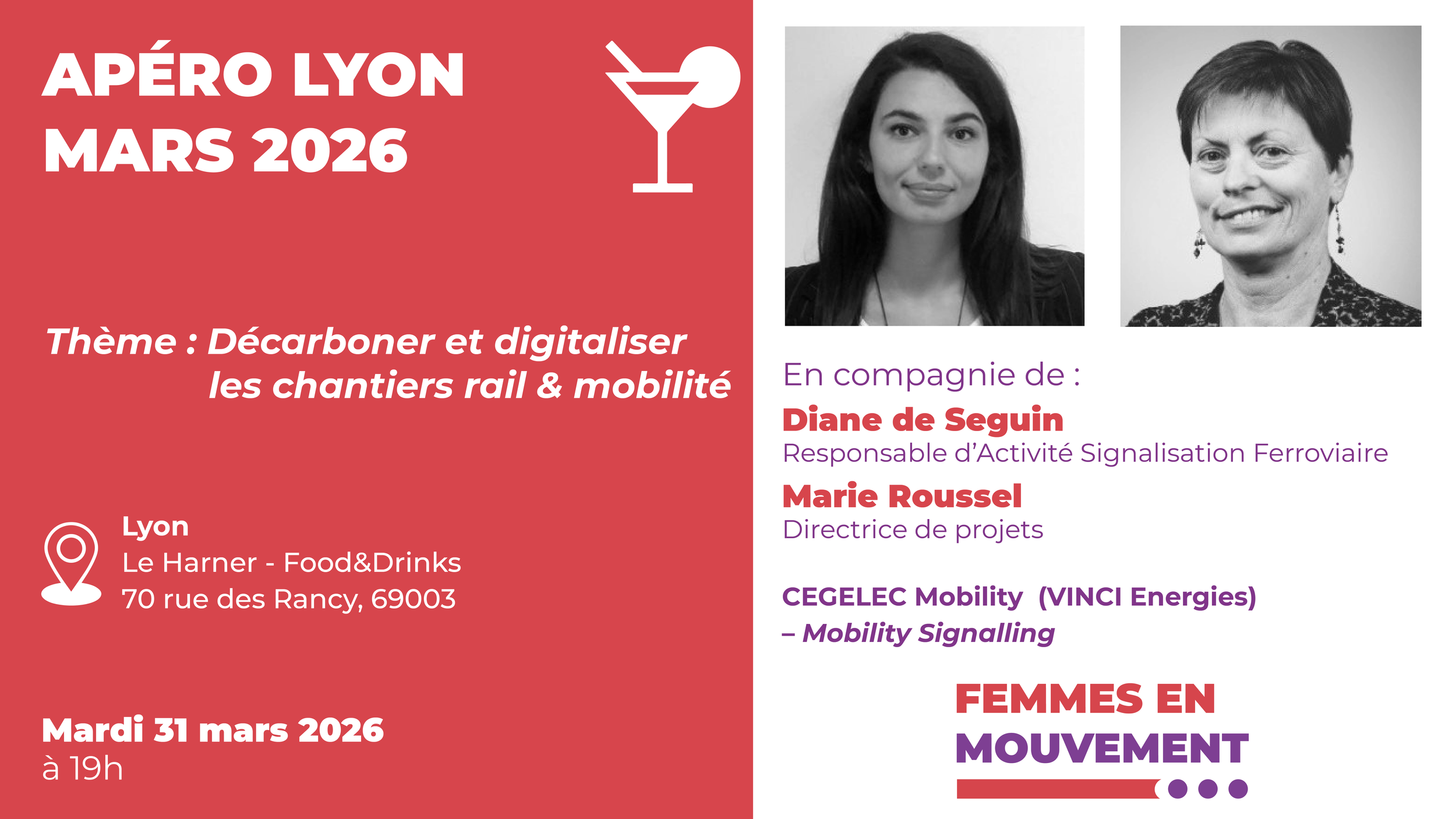 L’antenne lyonnaise est heureuse de vous inviter le mardi 31 mars 2026 à un apéro en présence de deux invitées : Diane de Seguin, Responsable d’Activité Signalisation Ferroviaire et Marie Roussel, Directrice de projets, toutes les deux chez Cegelec Mobility (VINCI Energies). Thème de la rencontre : décarboner et digitaliser les chantiers rail & mobilité.
